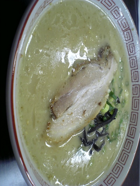 出てきたのはただの豚骨ラーメンと思いきや、濃度に驚く。しっかりと濃度があるのに臭みはなくすっきりした感じ。自分がスープを取りの時に失敗してかなりの高濃度でとった事があるが、それに近い。理論的にも美味しくもちろん食べて美味しい。(結果として九州ツアーNo.1の座を獲得)