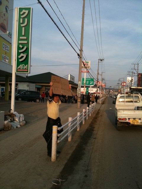 ここは僕らのヘルプですね。車道へも飛び出して炊き出しをお知らせしていると、信号待ちの車から